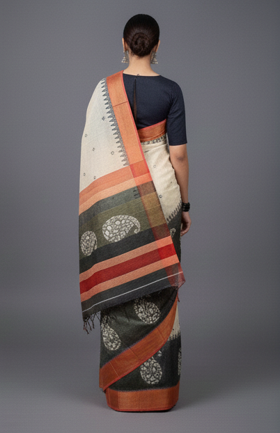 The saree comes in 6.30 meters length along with a matching digital print blouse made from linen with a gold jari border.