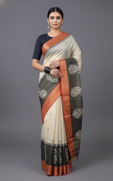 Enhance your ethnic look with this premium Linen Saree featuring a rich gold jari border and elegant digital print work.