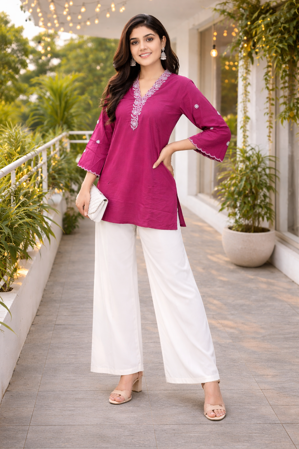 This elegant full pair includes a stylish short tunic top with delicate embroidery work and a comfortable matching palazzo, creating a trendy and graceful look.