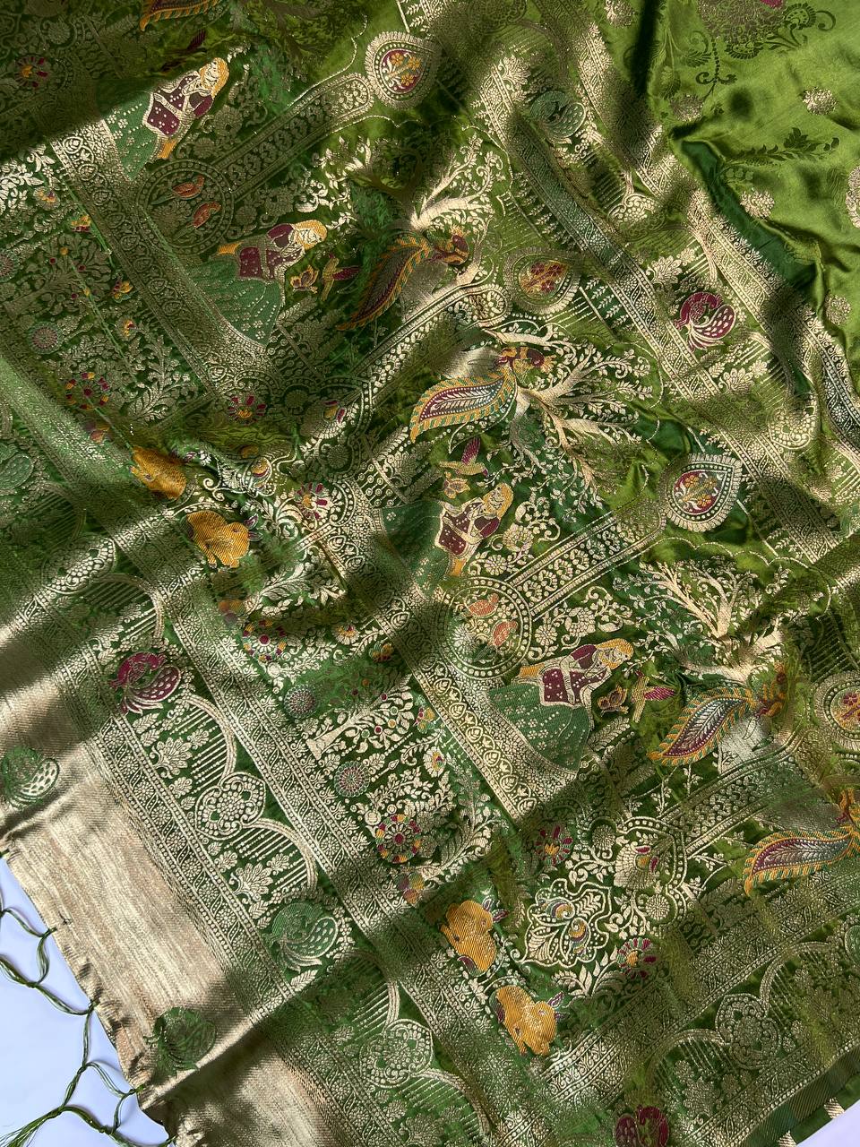 This saree features a soft and shiny satin drape that flows beautifully, enhanced with a geometrical designer body and elegant dying with meena work. The rich hockey border and heavy zalar work add a premium Banarasi touch, making it ideal for wedding and festive wear.